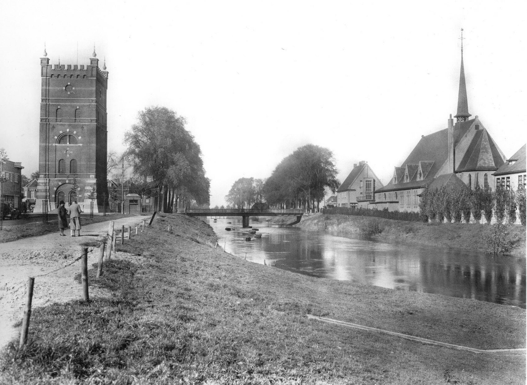Begin van het Stadsdeel Graafsepoort. De Aabrug (Nu Bartenbrug) over Rivier de Aa, Gezien vanaf de Bossche Pad. Links de watertoren aan de Aastraat, rechts de HH.